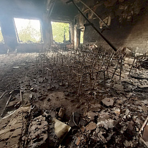 They hit the school, which is closer to "Caravan" as Studentska street to cross. They hit the second floor. There was a hole, probably one and a half meters long, in the wall. More than one projectile hit there. Student Street was shelled. The sixteen-story building was burning - the upper floors. The tire repair shop, next to the subway, was also on fire.