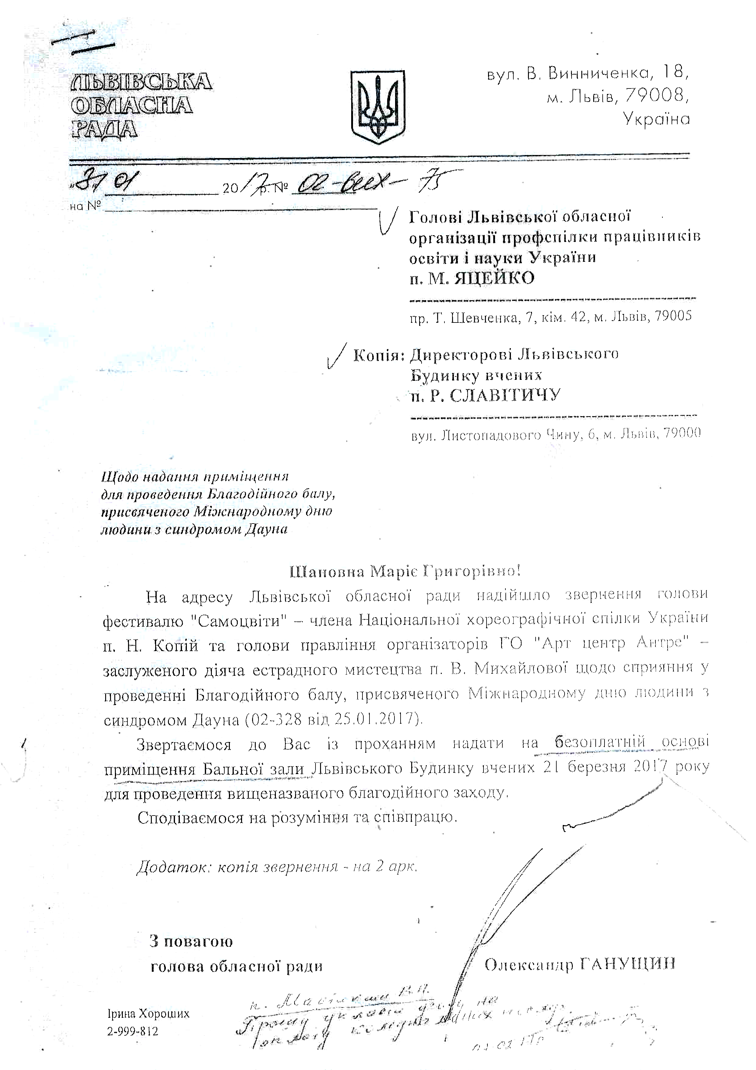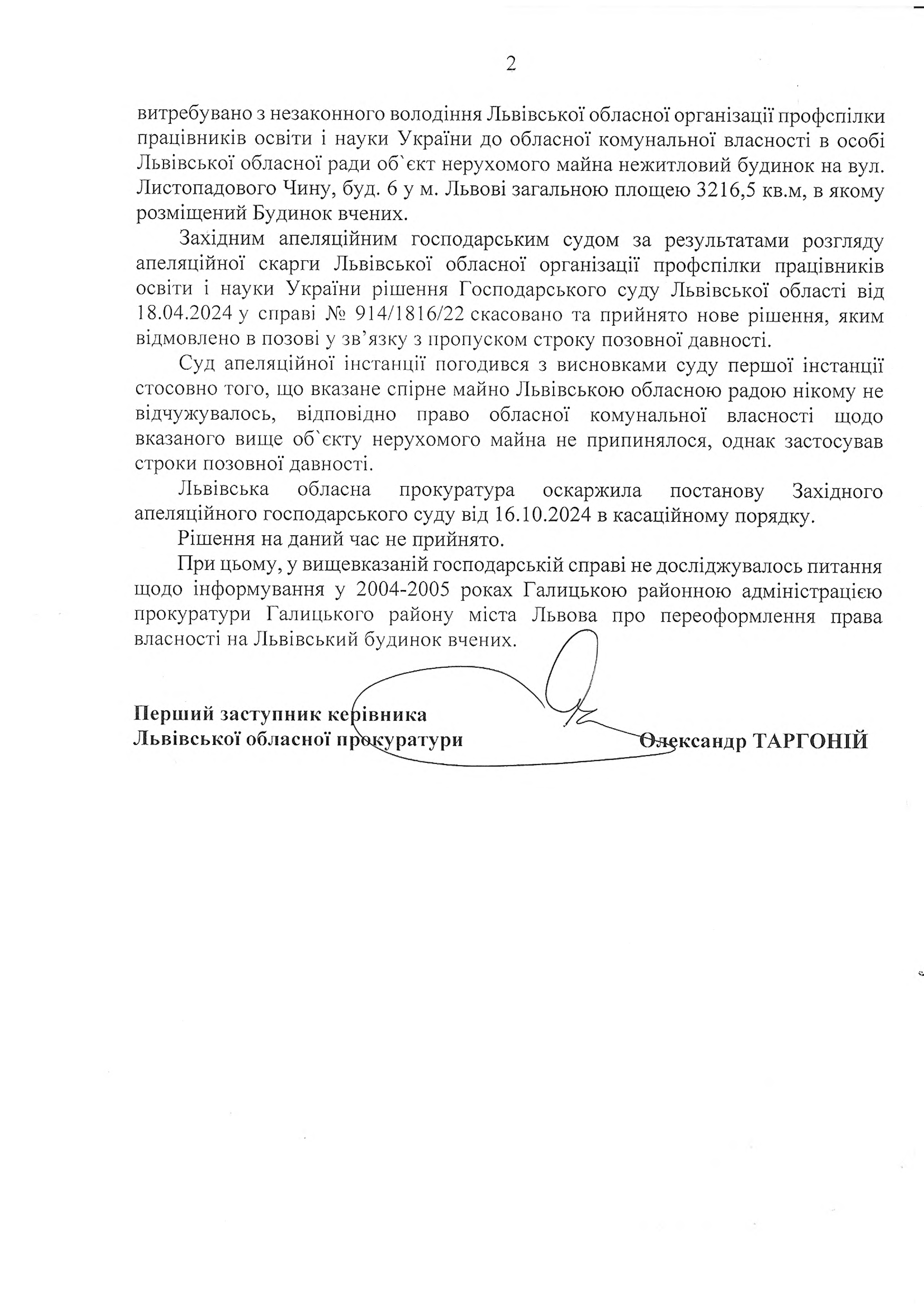Саме тоді він підписав розпорядження про видачу права власності, на Львівський будинок вчених, Львівській обласній організації профспілки працівників освіти і науки України.