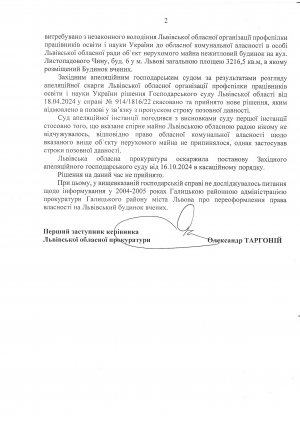 ЛОР було про це відомо. Адже вони неодноразово - і я це до матеріалів судової справи долучив - зверталася як до Львівської обласної організації профспілки і науки, так і до Центрального комітету - з листами про те, щоб надати Львівській обласній раді вказане приміщення - для певних заходів культурного, освітнього та іншого характерів - , підсумовує адвокат Іван Качмар.